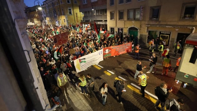 „Kein Völkermord, Israel raus aus der FIFA“: Unter diesem Motto zogen Tausende Menschen durch die Innenstadt von Udine und zeigten Palästina-Flaggen. Kurz vor dem Anpfiff der Partie kam es zu Zusammenstößen zwischen Demonstranten und der italienischen Polizei.